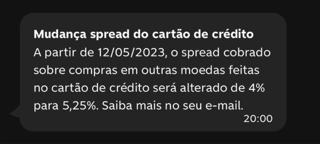 O C6 Bank enviou mensagens aos seus clientes sobre a nova mudança que será realizada a partir do dia 12 de maio (sexta-feira). A partir desta data, todos os cartões de crédito do banco passarão a pagar uma taxa de spread de 5,25% em compras realizadas em outras moedas.